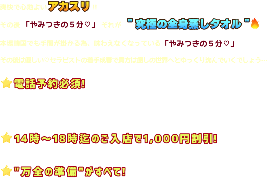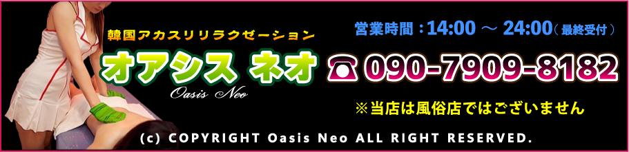 本場の韓国アカスリエステを提供するオアシス ネオです!お客様ひとりひとりに心を込めた施術♪ニューオープンしたばかりのお店なのでスタッフ全員で一生懸命に癒させて頂きます!ご来店お待ちしております!